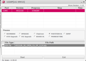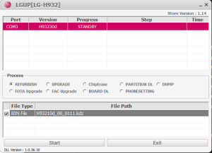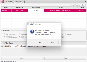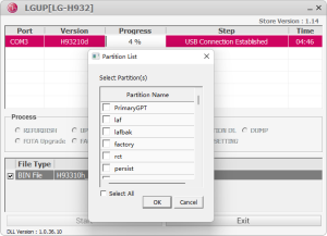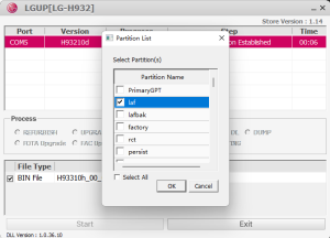 2. 重启再次进入下载模式,进系统过引导(防止刷完进不去系统),打开LGUP 将H93310h拖入下面列表,在Process框选择PARTITION DL