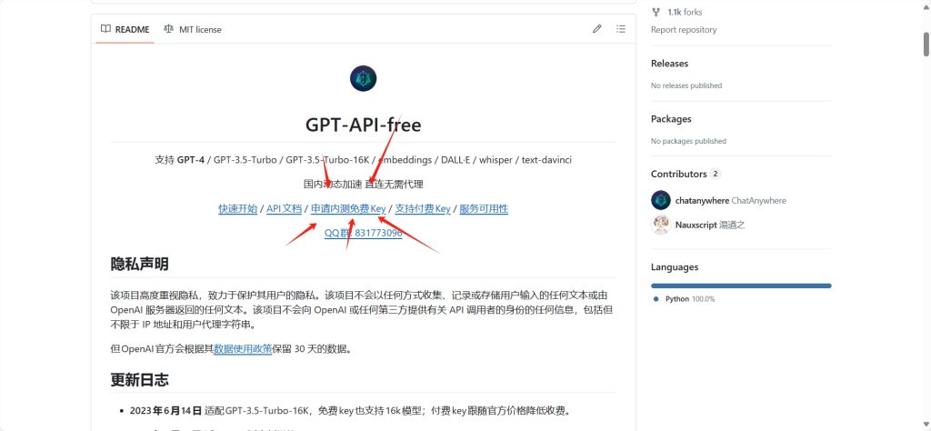 此免费项目的key,的中转地址在项目中有提到